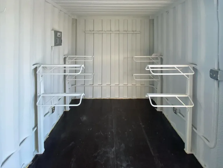 Strong and weatherproof 20ft insulated storage container PA with shelving, spray foam insulation, LED lighting, and power outlets. Ready for secure storage or mobile workshop use.